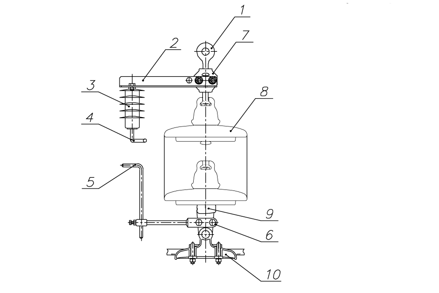 1 - серьга СРС-7-16 или СР-12-16, 2 - кронштейн, 3 - ОПН, 4 - электрод № 1, 5 -электрод № 2, 6 - кронштейн, 7 - узел фиксации серьги, 8 - изолятор, 9 - ушко У1-7-16 или У1-12-16, 10 - поддерживающий зажим*.