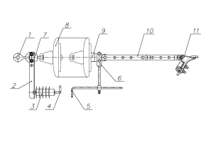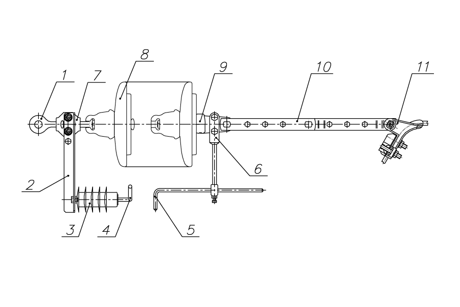 1 - серьга СРС-7-16 или СР-12-16, 2 - кронштейн, 3 - ОПН, 4 - электрод № 1, 5 - электрод № 2, 6 - кронштейн, 7- узел фиксации серьги 8 - изолятор, 9 - ушко У1-7-16 или У1-12-16, 10 - звено промежуточное регулируемое ПРР-7-1 или ПРР-12-1, 11 - натяжной зажим**.