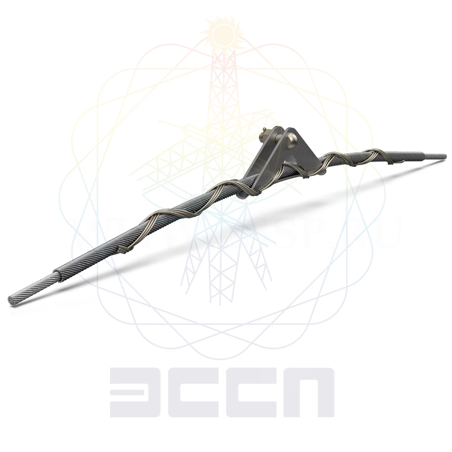 Для дополнительной защиты от вибрации в поддерживающем зажиме и ремонта стального троса при повреждении до 30% сечения.Состав зажима: Протектор, выполненный из отдельных проволочных спиралей или спиральных прядей; две силовые пряди, имеющие взаимно противоположное направление навивки; штампованную оцинкованную лодочку и крепежные детали (палец, шайба, шплинт).