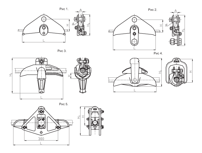 Марка зажима | Рис. | Размеры, мм | Диаметр алюминиевых, сталеалюминиевых и медных проводов, мм | Масса, кг | Разрушающая нагрузка, кН (т.с.), не менее | ||||