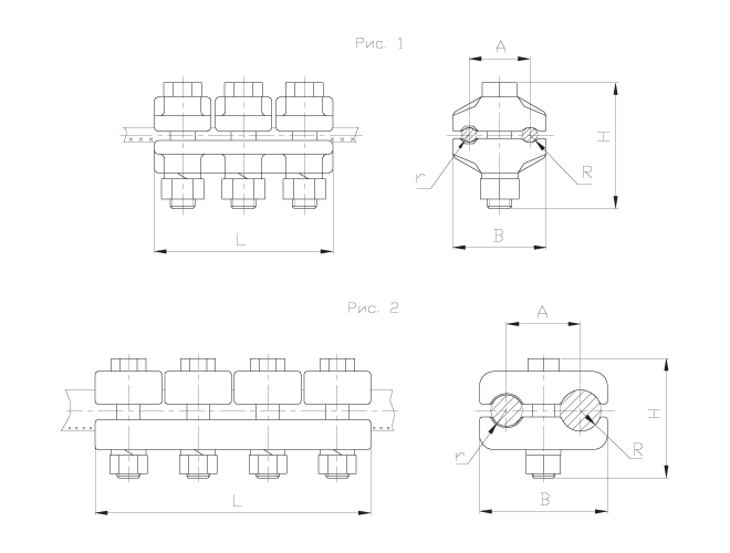 | Марка зажима | Рис. | Номинальное сечение, мм2, проводов по ГОСТ 839-80, марок | Диаметр проводов, мм | Размеры, мм | Масса, кг | |||||||