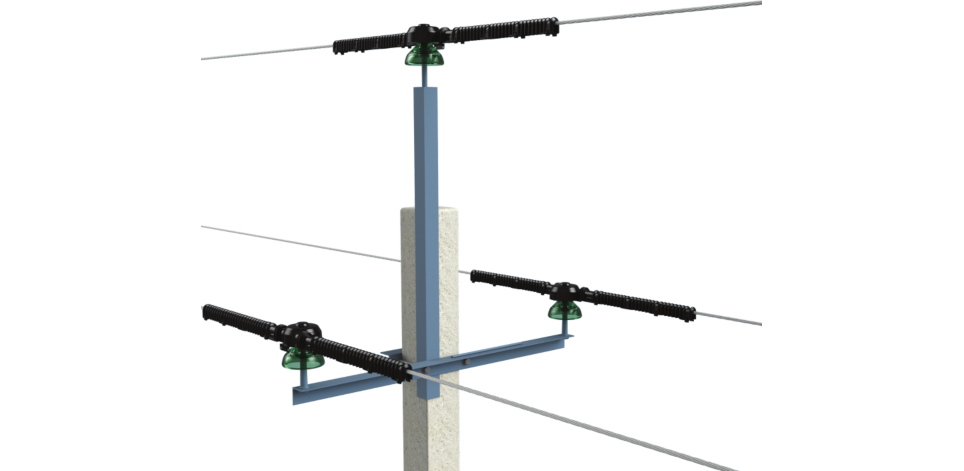 В случае, когда применяется траверса с двойным креплением провода и перепадом высот, проявляют себя прекрасные гибкие свойства материала ПЗУ, эффект от которых усиливают две волны гофры с увеличенным углом примыкания.