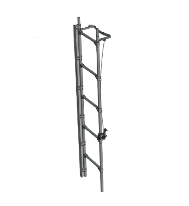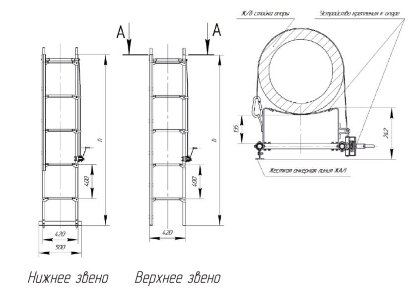 - Лестница – в зависимости от требований заказчика формируется комплект из необходимого количества звеньев лестницы со смонтированными на них участками жесткой анкерной линии (ЖАЛ) в виде алюминиевого профиля. ЖАЛ является неотъемлемой составляющей каждого звена лестницы типа ЛС с ЖАЛ.