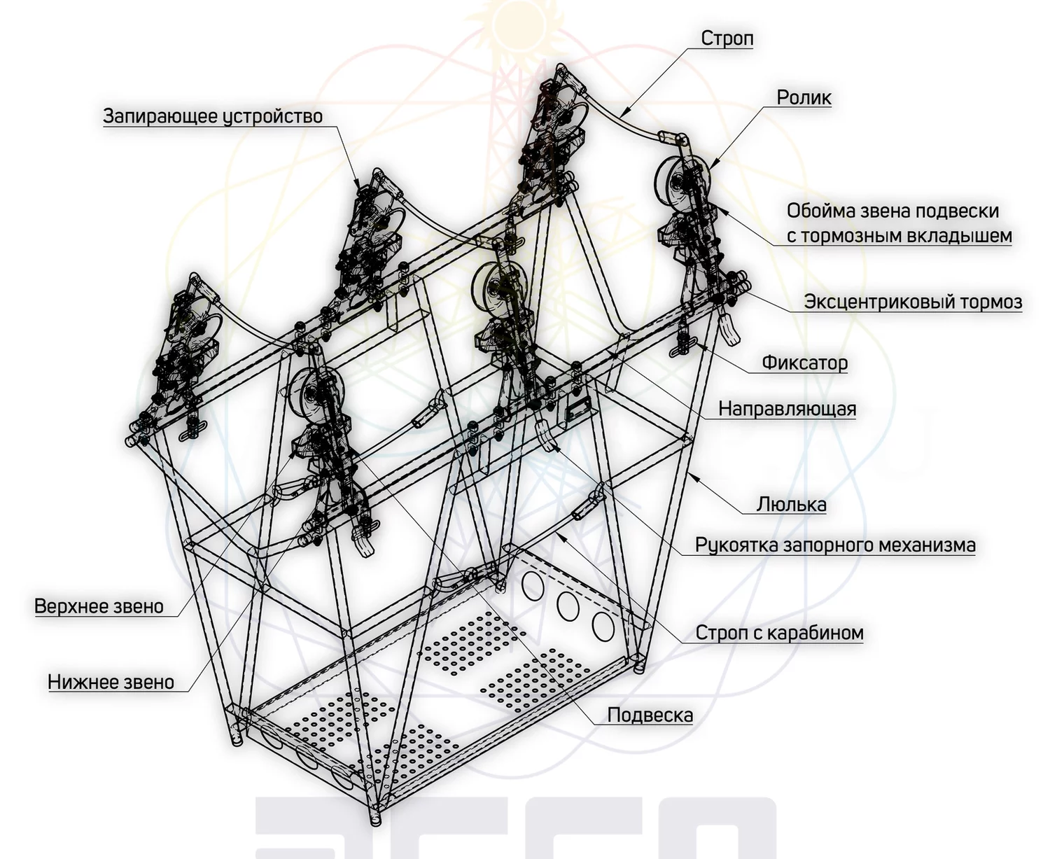 Тележка для передвижения по проводам расщепленной фазы модель № 13242.10.00.000 (ТУ 5221-130-27560230-13) предназначена для передвижения одного электромонтёра по проводам расщепленного молниезащитного троса или верхним проводам расщепленной фазы с расщеплением от 2 до 8 проводов, при проведении монтажных и ремонтных работ на ВЛ 330-1150 кВ.Конструкция тележки выполнена в климатическом исполнении УХЛ 1 по ГОСТ 15150-69.