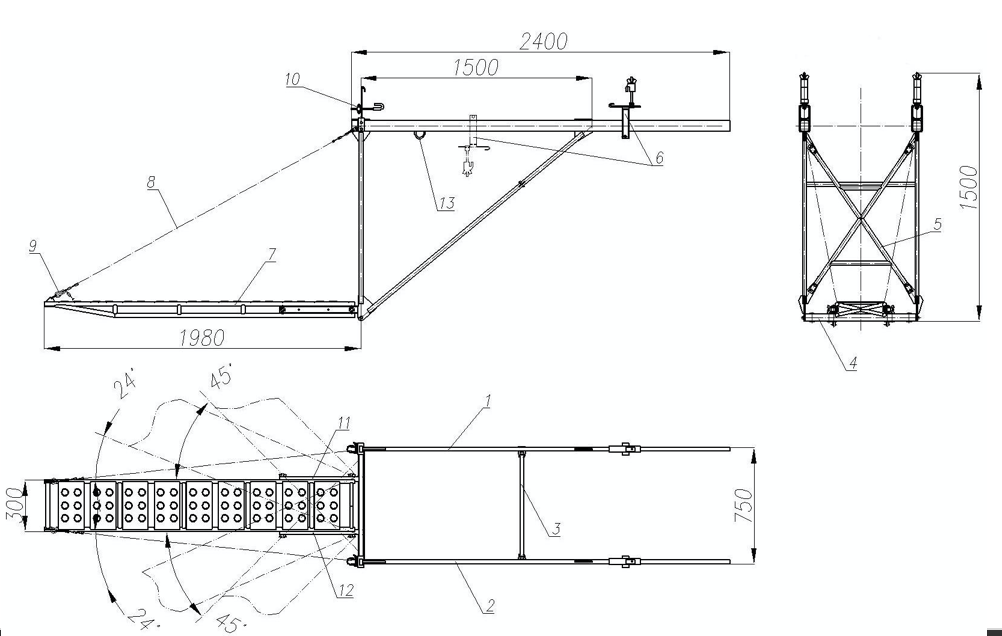 Трап предназначен для работы в горизонтальной плоскости с возможностью изменения угла поворота рабочей площадки в обе стороны на 0°, 24° и 45°.