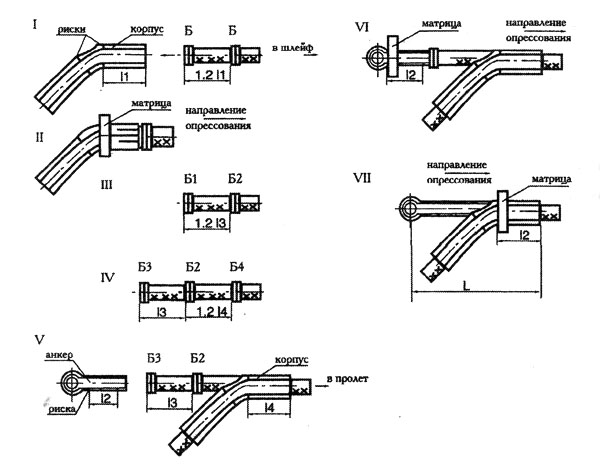 Корпус с запрессованным в нем проводом шлейфа надвигается на конец провода, идущего в пролет. В конец провода, ровно отрезанного по отметке, вводится до упора анкер-вкладыш (положение III), после чего на анкер надвигается корпус, который опре ссовывается в направлении стрелки от риски II до конца корпуса в сторону пролета (положение IV). Положение V - натяжной зажим в опрессованном состоянии.